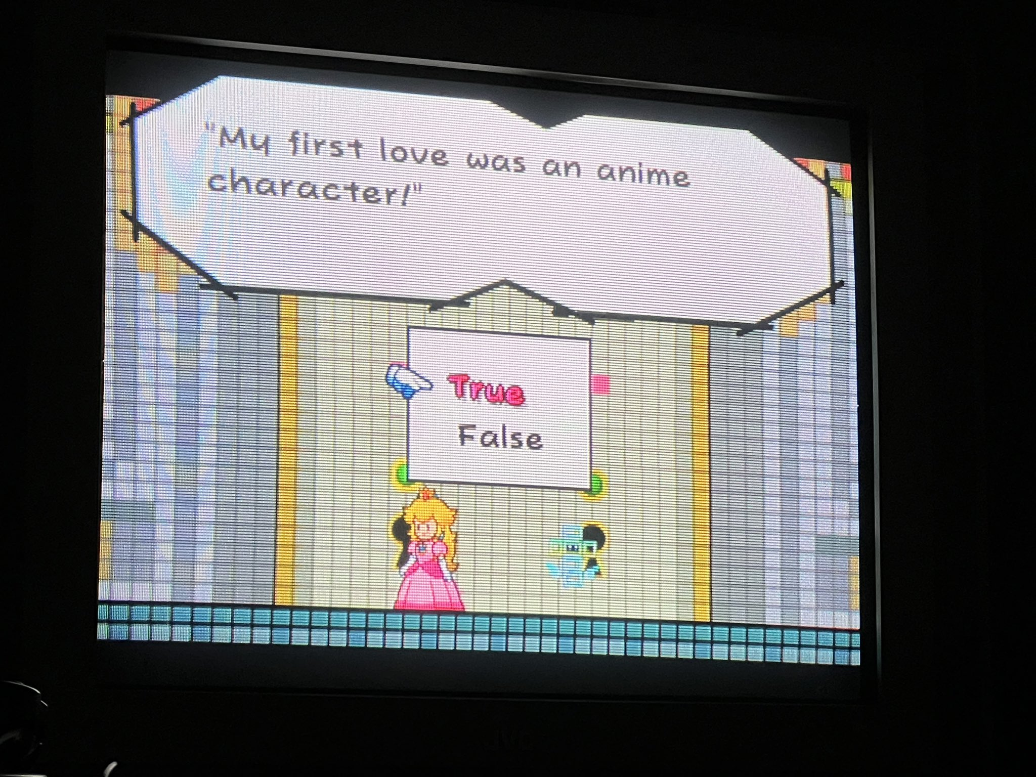 Here's a photo of the TV in action. Interestingly enough, THAT had to be the best picture of the TV I took that I had saved... I love Super Paper Mario and its quirky writing, and it was simply way ahead of its time in that regard. Half an hour before I wrote this, I was DAMN NEAR CLOSE to beating Wracktail in the pit of 100 trials, died, and I'm absolutely livid. I guess 2 Life Shrooms was NOT enough for the NEARLY 1 HOUR I SPENT GETTING THROUGH THE FIRST 99 TRIALS.